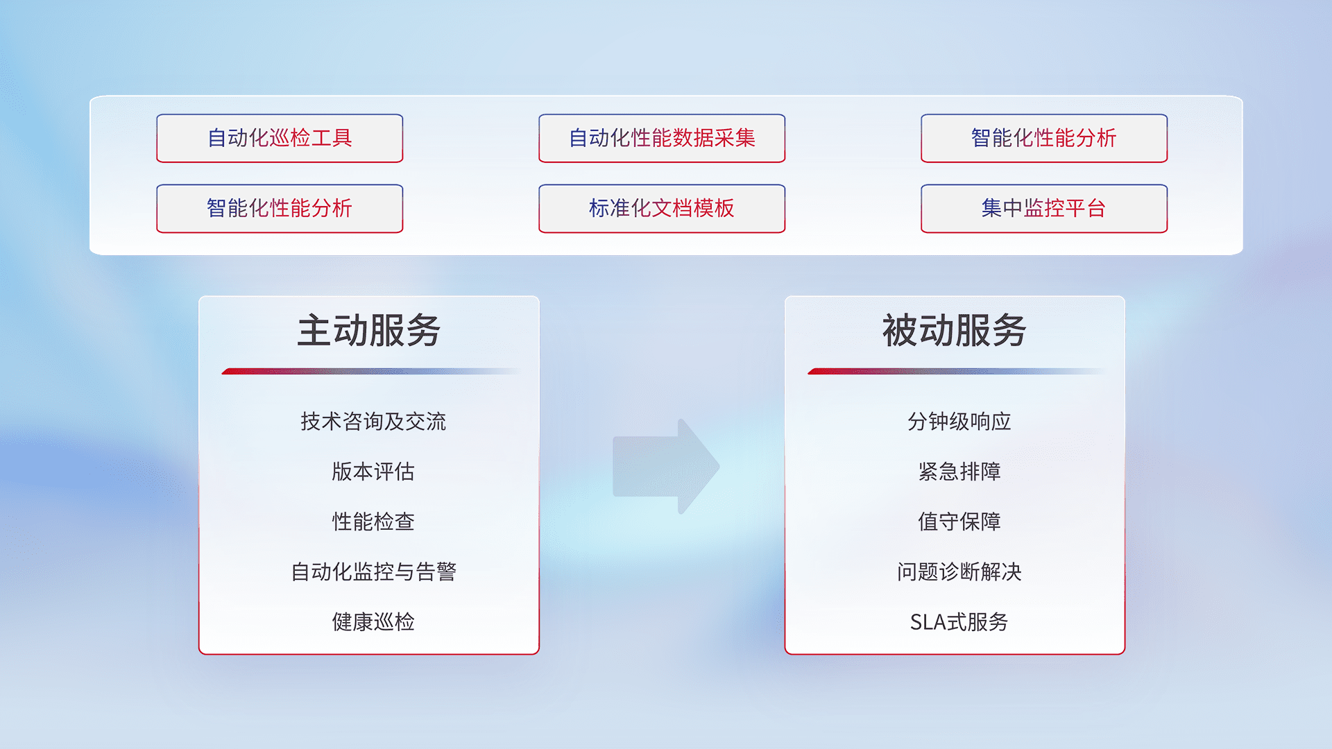 智能化工具和标准化文档,,保障服务质量,,提供主动服务(包含技术咨询、、、版本评估、、、性能检查、、、自动化监控与告警、、、、健康巡检)和被动服务包含(分钟级响应、、紧急排障、、、、值守保障、、、问题诊断解决、、、、SLA服务)。。